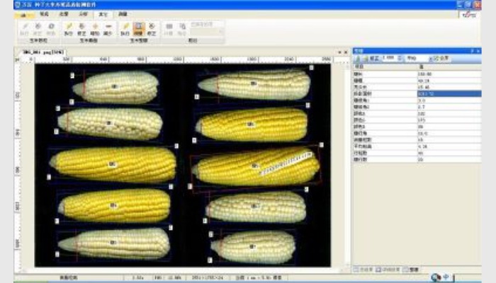 (2)全自動測出各玉米穗長、穗粗、禿尖長、左右穗緣角、穗行角、平均行粒數、粒厚、截面穗行數、穗粗、軸粗,以及其平均值,可自動測出各玉米截面上的平均粒長、平均粒寬等參數。