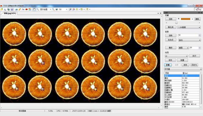 (4)可同時測量30只柑橘類水果的:縱徑、橫徑、果形指數、總面積、皮厚、肉色分檔分析、外周長。