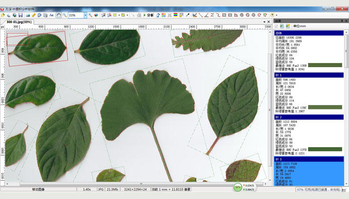 2、可大批量全自動分析多片葉葉面積、周長、最大葉長、最大葉寬、矩形度、凹凸比、球狀性、形狀系數和蟲洞數量,并標記葉片邊緣以便核對正確性。